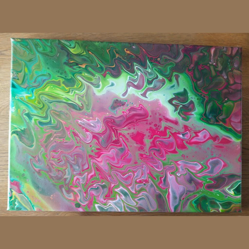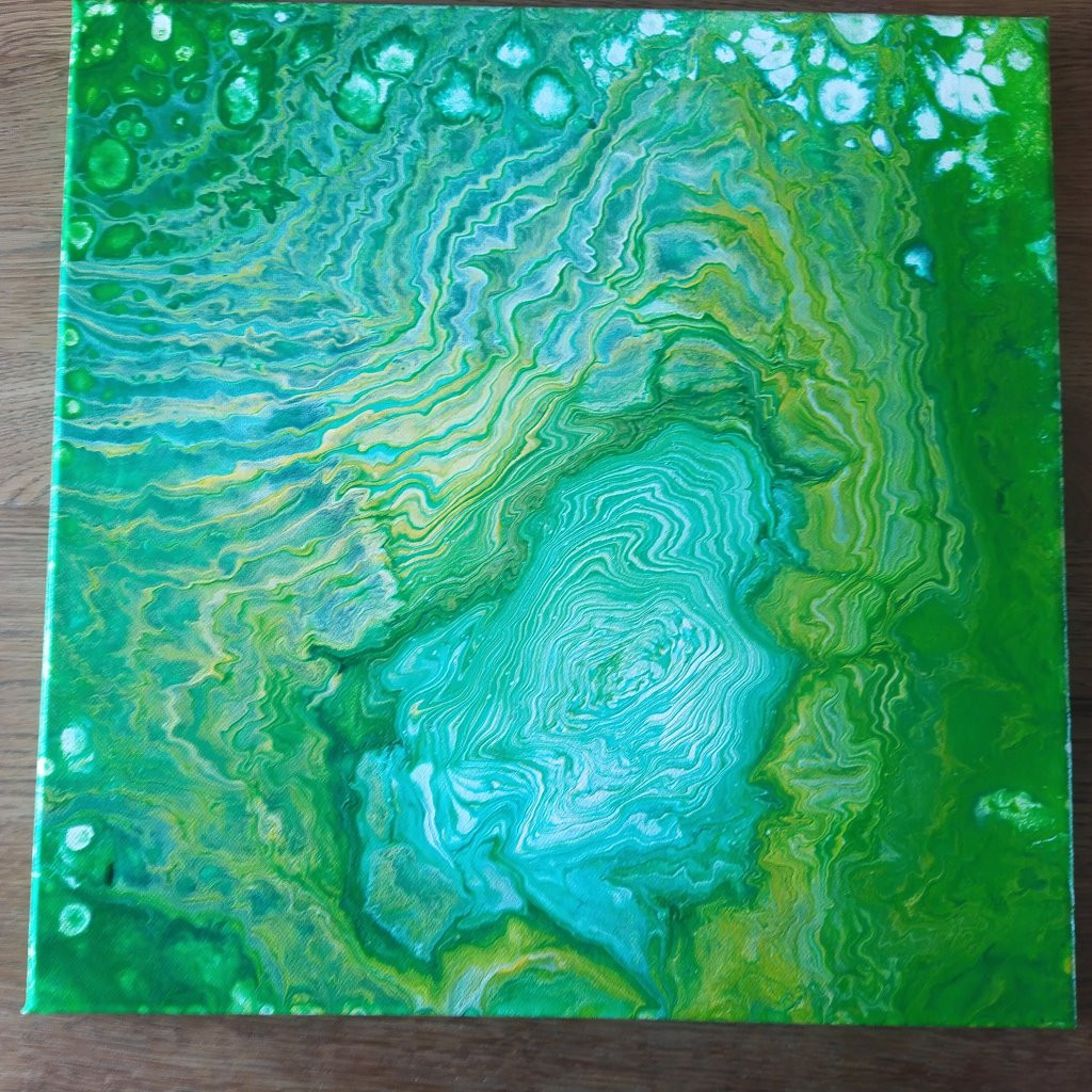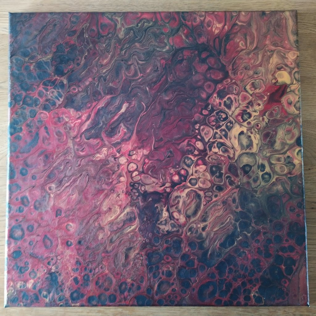 Da war Acrylic Pouring schon etwas anderes. Hierbei werden die Farben mit Verdünnungsmitteln in eine flüssige Konsistenz gebracht und mit verschiedenen Techniken auf die Leinwand gegossen. Meist schwenkt man die Farbe dann oder manchmal bläst man sie auch über die Leinwand, bis ein Bild entstanden ist, mit welchen man zufrieden ist (oder auch nicht). Ein paar kleine Tropfen Silikon in manchen Farben führt übrigens zu den schönen Zellen, die dadurch entstehen, dass Farbschichten aufreissen und die darunterliegenden freigeben.