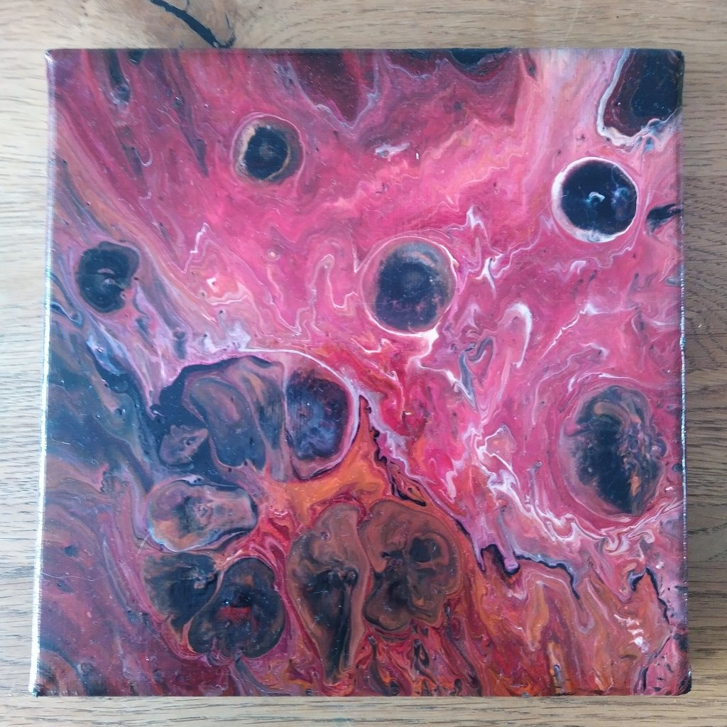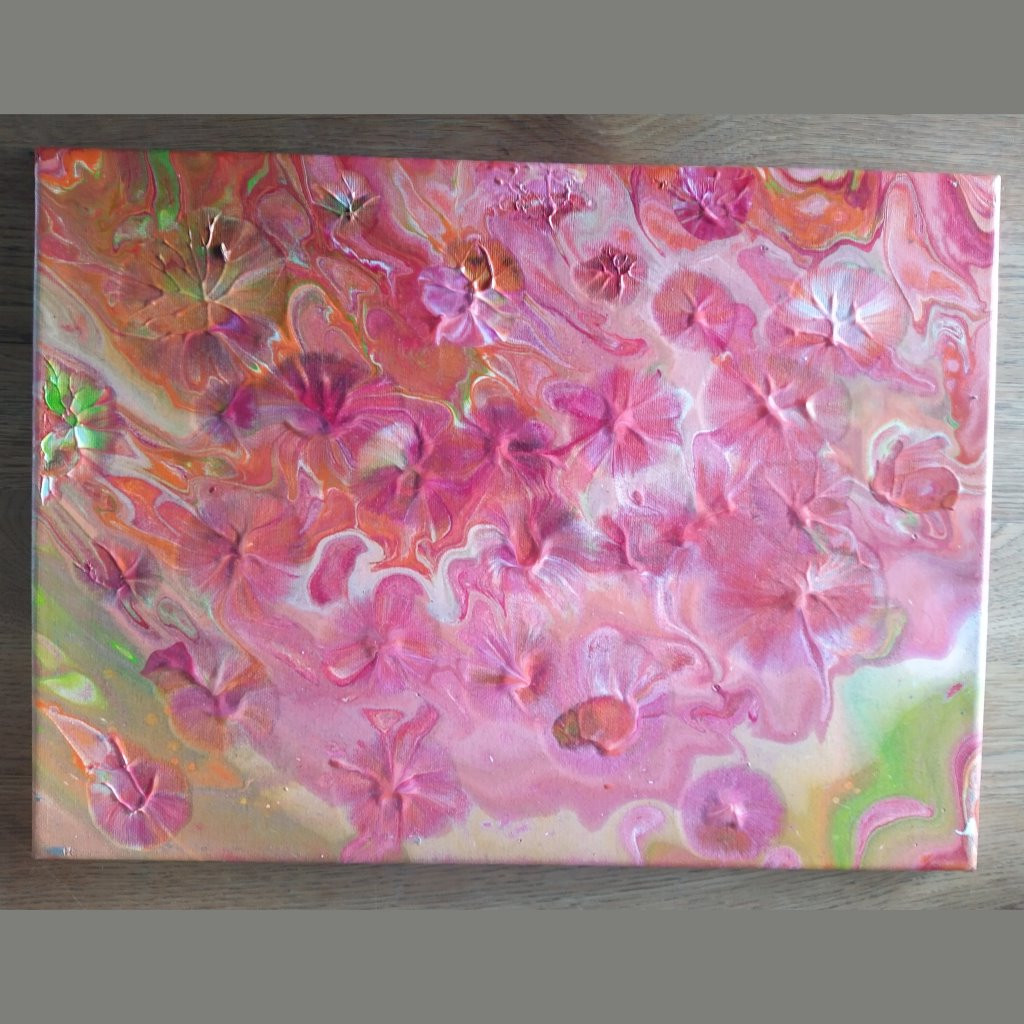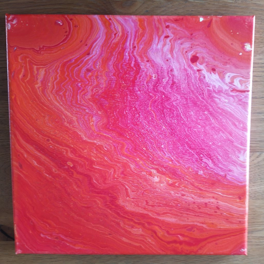 Da war Acrylic Pouring schon etwas anderes. Hierbei werden die Farben mit Verdünnungsmitteln in eine flüssige Konsistenz gebracht und mit verschiedenen Techniken auf die Leinwand gegossen. Meist schwenkt man die Farbe dann oder manchmal bläst man sie auch über die Leinwand, bis ein Bild entstanden ist, mit welchen man zufrieden ist (oder auch nicht). Ein paar kleine Tropfen Silikon in manchen Farben führt übrigens zu den schönen Zellen, die dadurch entstehen, dass Farbschichten aufreissen und die darunterliegenden freigeben.