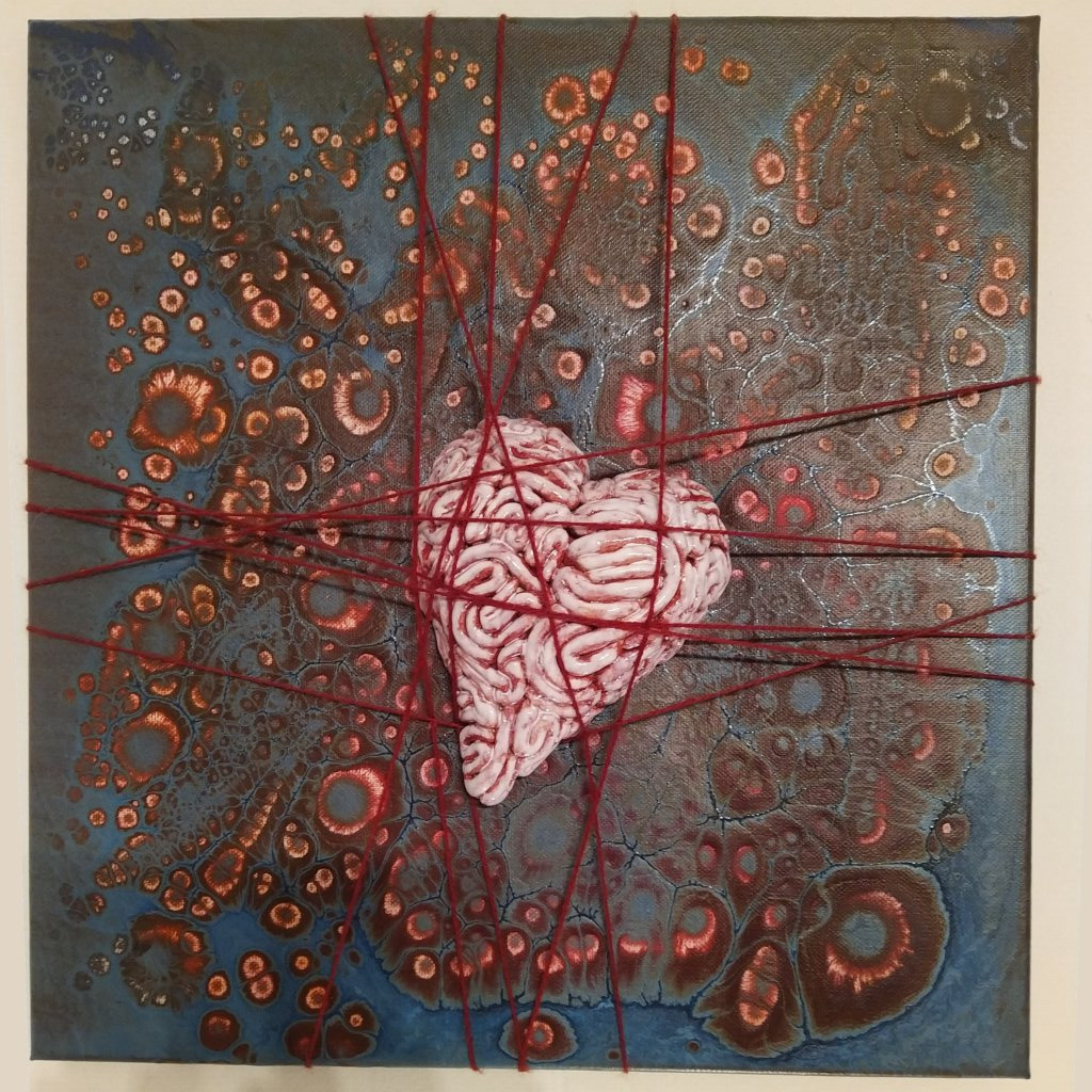Eins meiner Lieblingsbilder ist das Motiv mit dem getöpferten Hirn-Herz. Ich nenne es "Der Mensch, eingeflochten im Universum". Das Bild wollte ich ursprünglich vernichten, da die Farben sich zu sehr vermengt haben und keine klaren Kontraste erkennbar waren. Ich hab dann einen Zahnstocher in Silikon eingetaucht und das Bild etwas maltretiert. Dadurch sind diese Zellen entstanden und es wurde dann doch wieder ein kleines Kunstwerk.