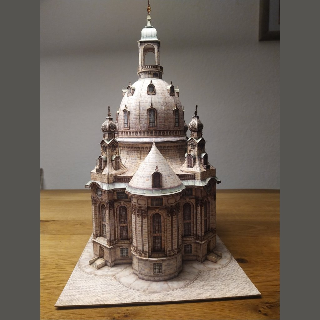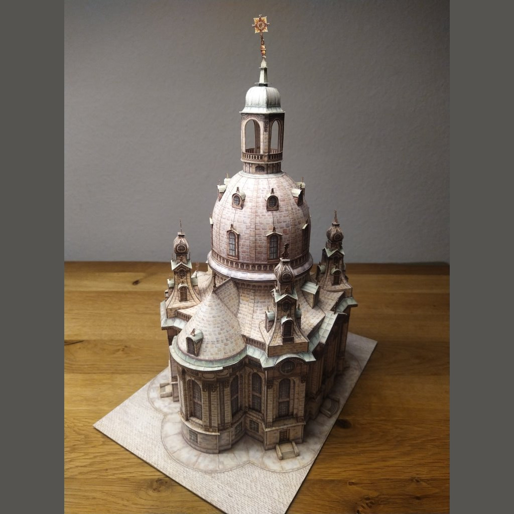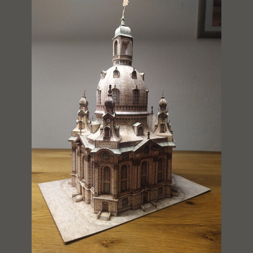 Hier ein Modell vom Schreiber-Verlag, welches man dort fertig auf Bögen kaufen kann. Die Frauenkirche in Dresden ist sehr bekannt. Allein schon deshalb weil sie im 2. Weltkrieg durch die Allierten Angriffe den Bomben zum Opfer fiel und vor allem dem im Stadtzentrum wütenden Feuersturm mit einer Brandhitze von bis zu 1200 Grad Celsius schutzlos ausgeliefert war. Über die zivilen Opfer dieses unmenschlichen Angriffs will ich da gar nicht sprechen. Sie wurde aber wieder errichtet und ich war auch schon mal drin.