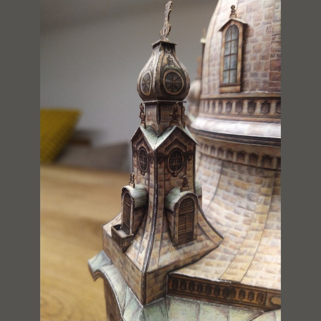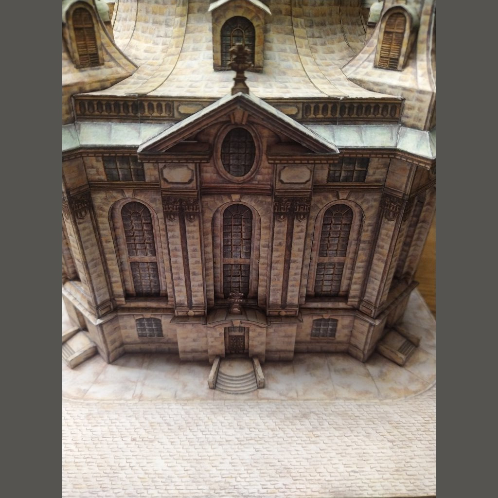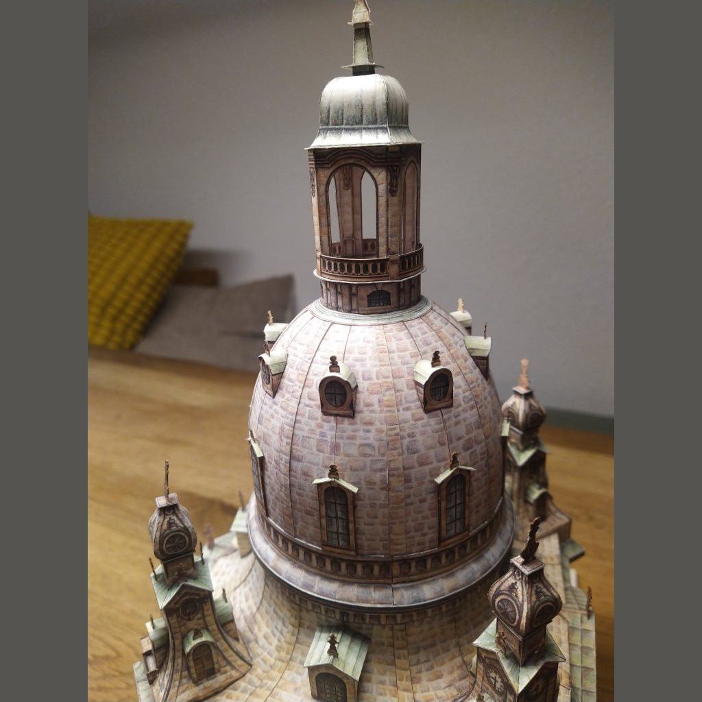 Hier ein Modell vom Schreiber-Verlag, welches man dort fertig auf Bögen kaufen kann. Die Frauenkirche in Dresden ist sehr bekannt. Allein schon deshalb weil sie im 2. Weltkrieg durch die Allierten Angriffe den Bomben zum Opfer fiel und vor allem dem im Stadtzentrum wütenden Feuersturm mit einer Brandhitze von bis zu 1200 Grad Celsius schutzlos ausgeliefert war. Über die zivilen Opfer dieses unmenschlichen Angriffs will ich da gar nicht sprechen. Sie wurde aber wieder errichtet und ich war auch schon mal drin.