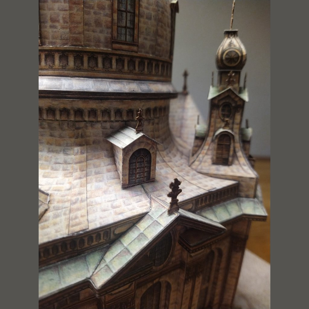 Der Maßstab ist 1:300 und damit ist das Modell 27,5 cm lang, 19 cm breit und stolze 33,5 cm hoch. Die alte Architektur insbsondere dieser Kirche läßt mich nach wie vor staunen. Das fertige Werk hat sehr schöne Rundungen und ist wirklich gut zu bauen.