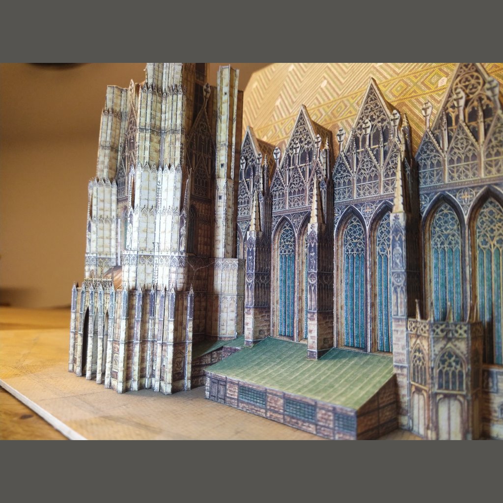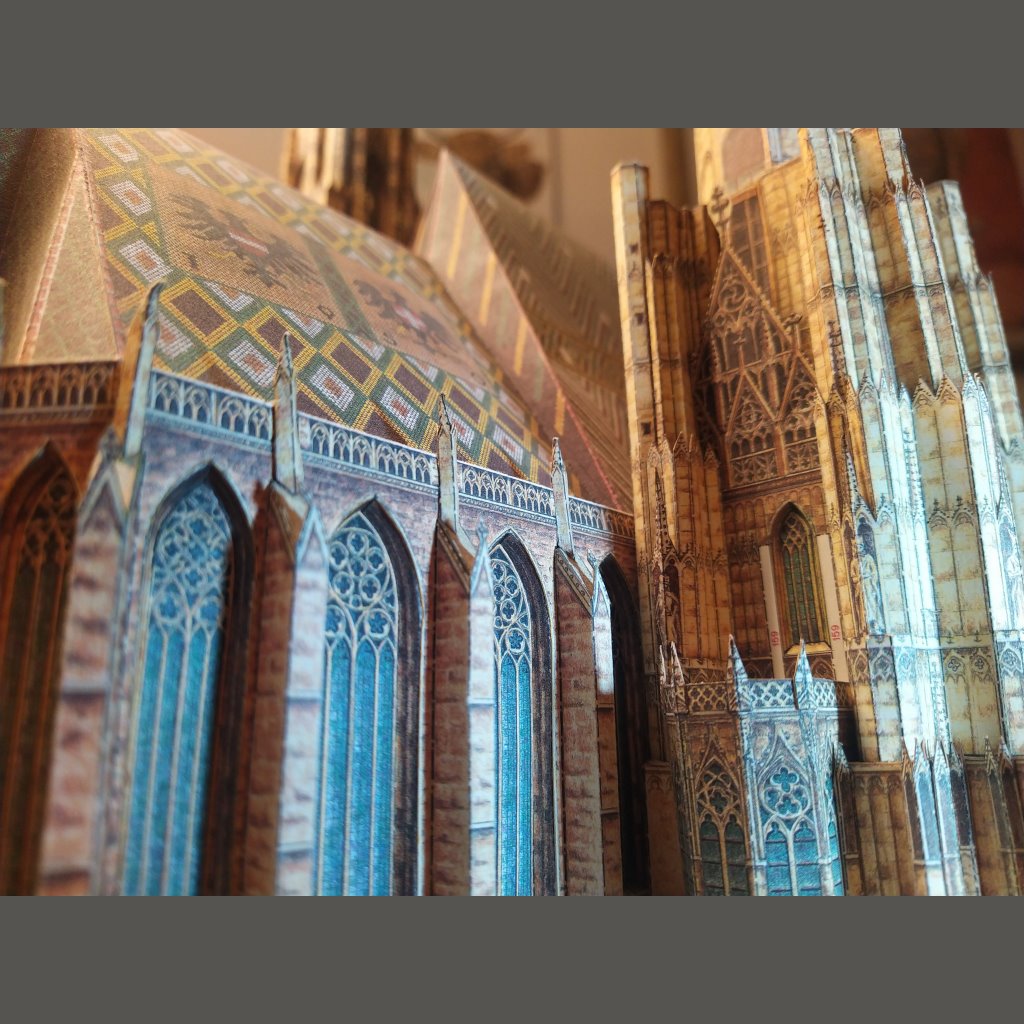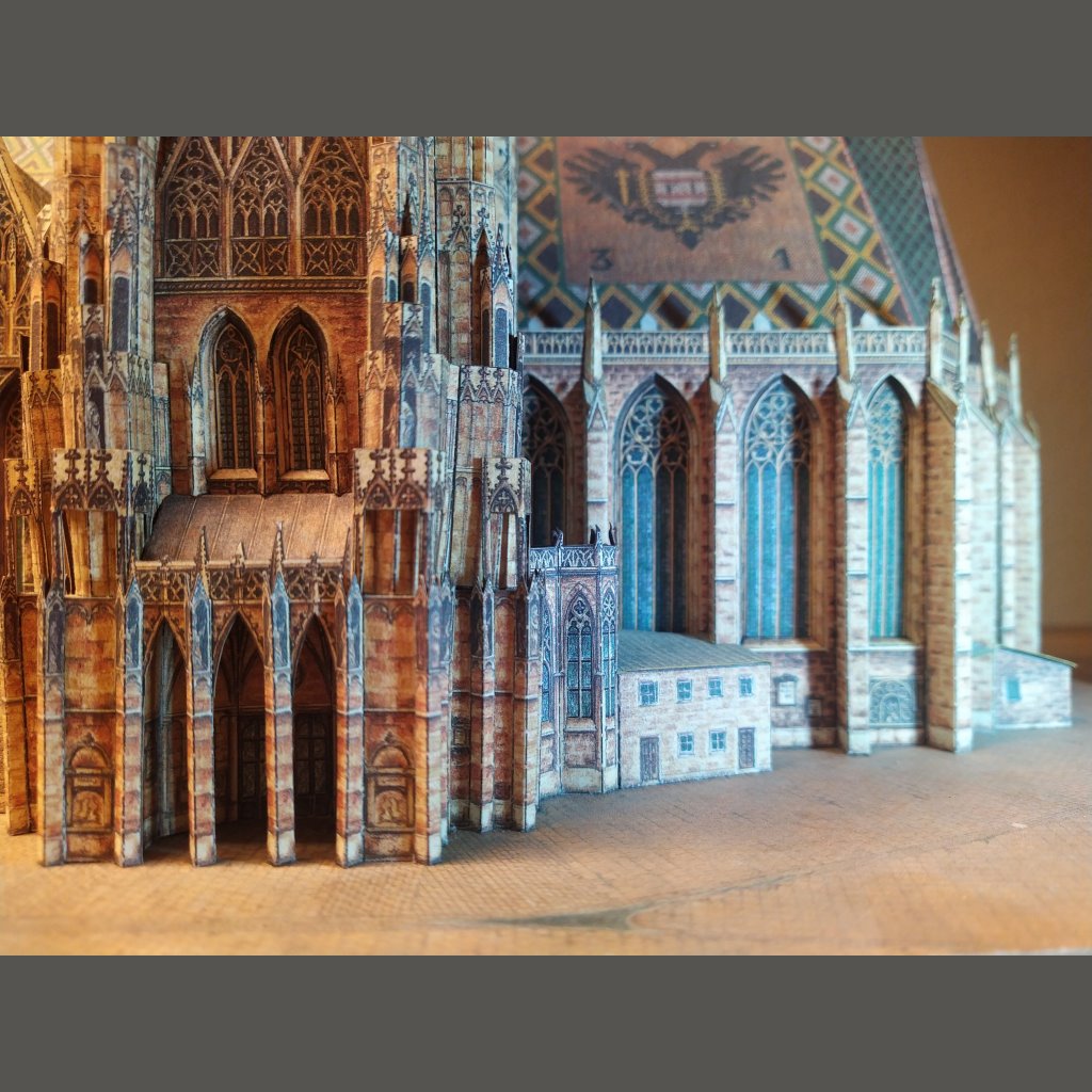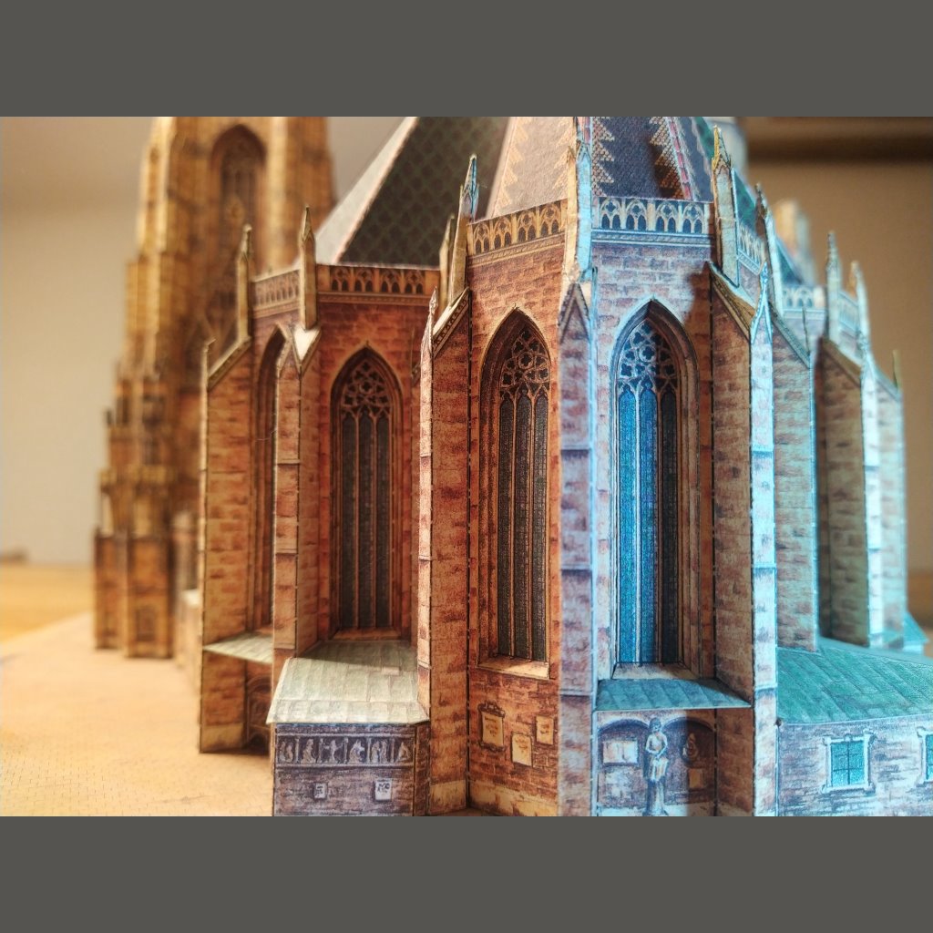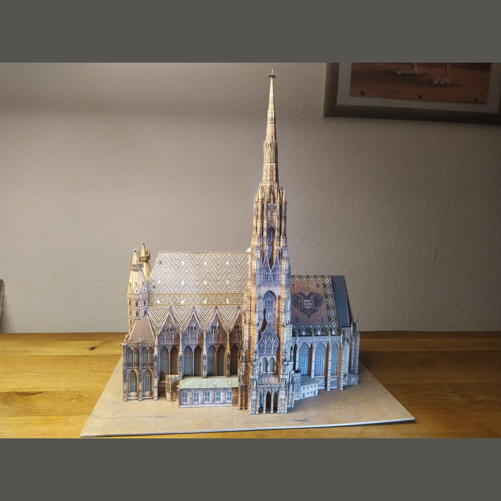 Der Stephansdom in Wien ist wirklich beeidruckend. Zweimal habe ich ihn bewundern dürfen und anschließend habe ich ihn gebaut. Die Bögen kommen wieder vom Schreiber-Verlag und beim Bau habe ich etwas Schwierigkeiten in der Grundkonstruktion bekommen. Da hat einiges nicht gepasst und ich musste ganz schön tricksen, damit der Rest noch funktionierte. Ich habe lange überlegt woher das Problem kam, das die Teile nicht zusammenpassten und gab dann Schreiber die Schuld. Einer muss sie ja bekommen.