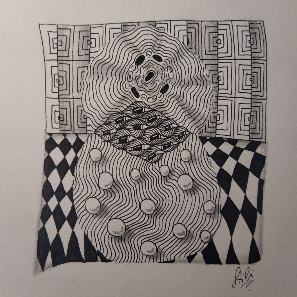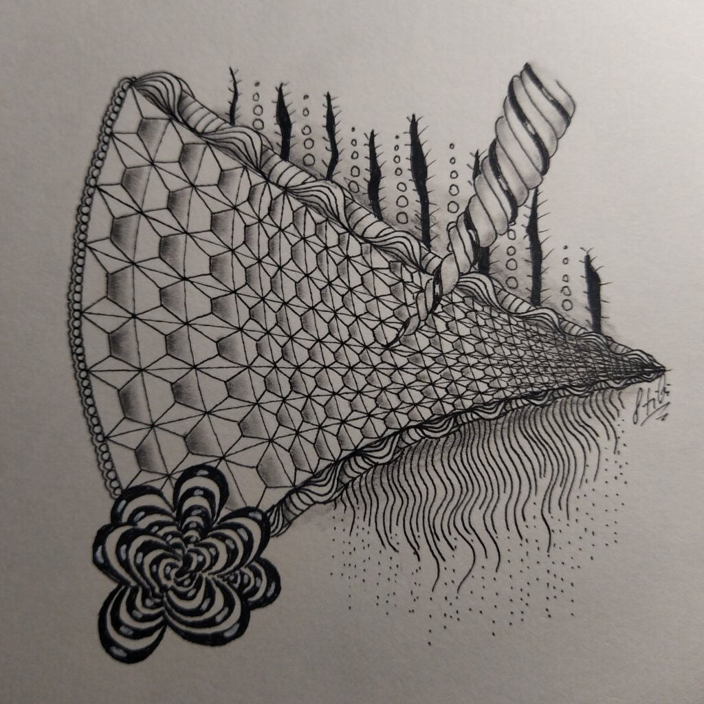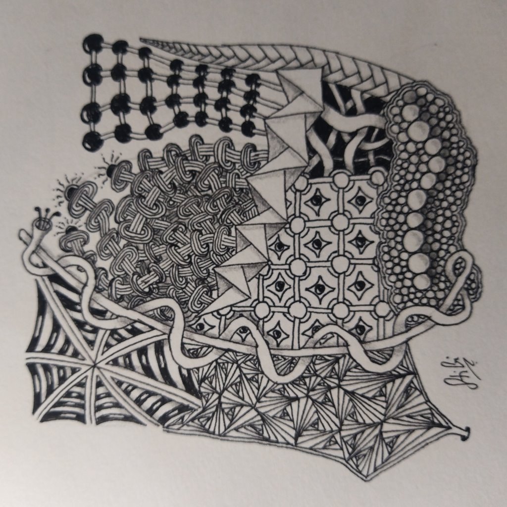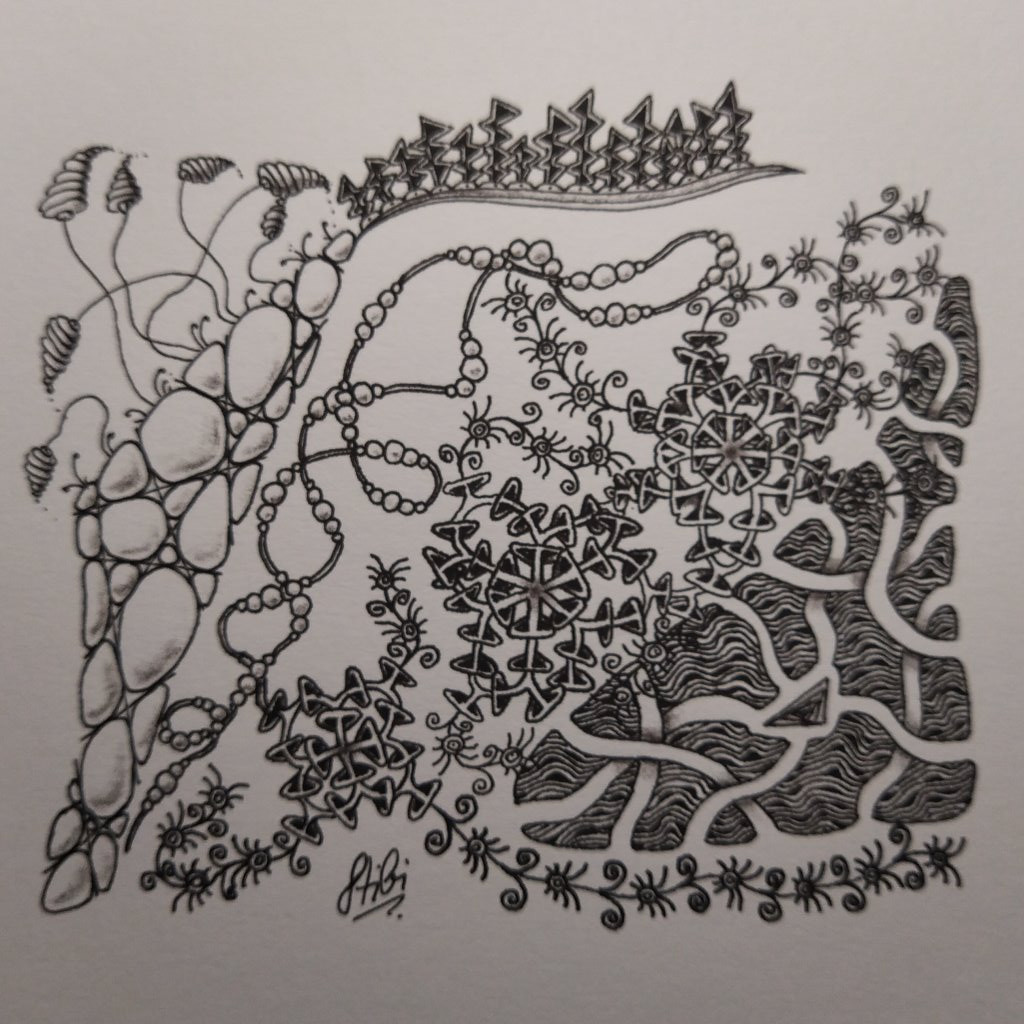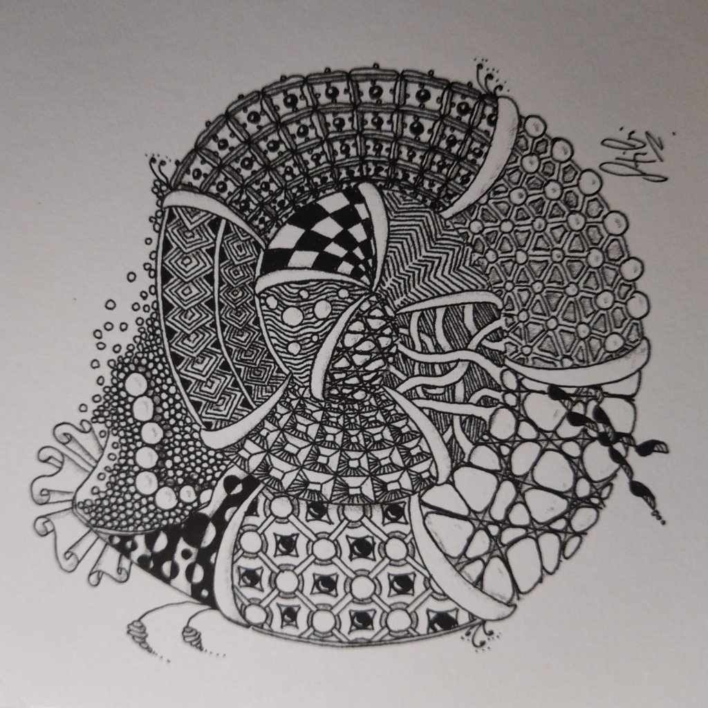 Eines meiner Hobbies ist Tanglen. In den letzten Jahren habe ich immer wieder solche Zeichnungen erstellt, die eigentlich im Grunde nur aus abstrakten Mustern bestehen, welche sich meist ohne vorherige Planung innereinander fügen und dann ein Bild ergeben, in welchen man sich manchmal sogar verlieren kann.